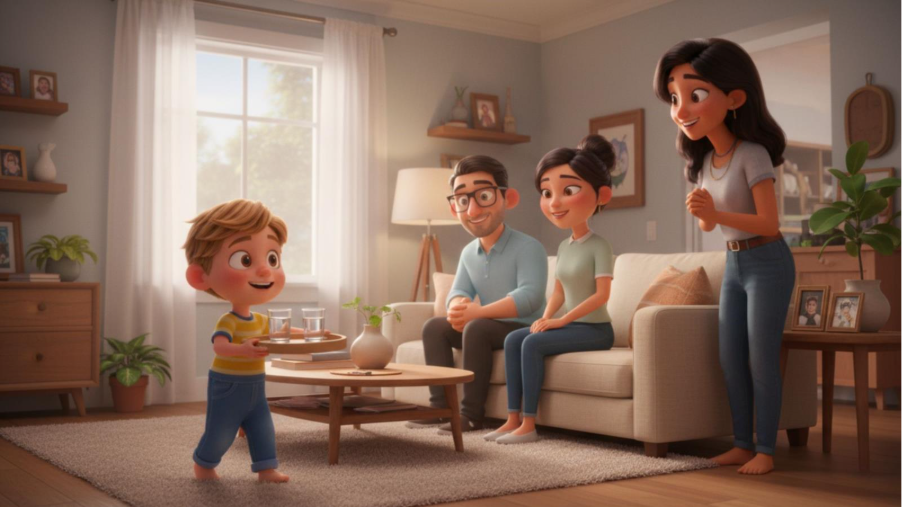 She smiled and handed it over. Carefully balancing the glasses, Riyan walked over and served everyone. He glowed with pride.