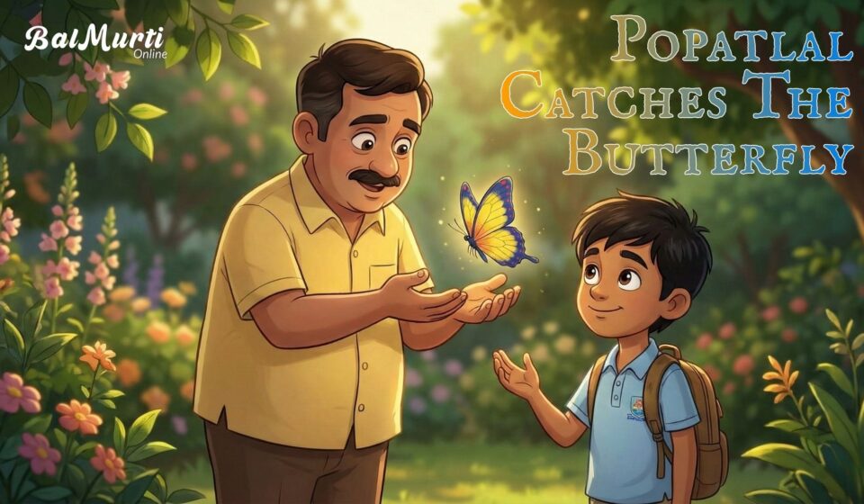 He looked around for the butterfly. It had flown to another flower. Popatlal approached slowly. The butterfly flitted again, and this time, Popatlal was ready. He reached out both hands and caught it!