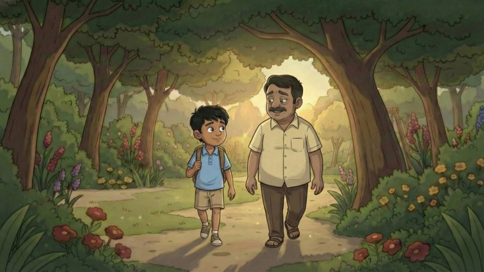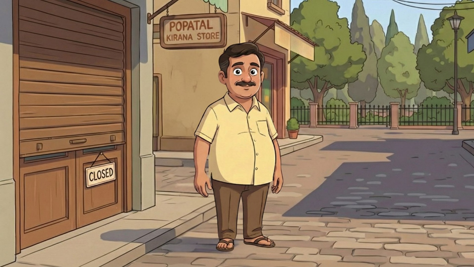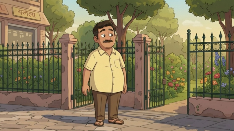 Once there was Popatlal. He used to pass by a garden every day on his way to and from the shop. Every time he passed, he wished he could go inside. But he never had the time. One day, he finally had some free time and went into the garden!