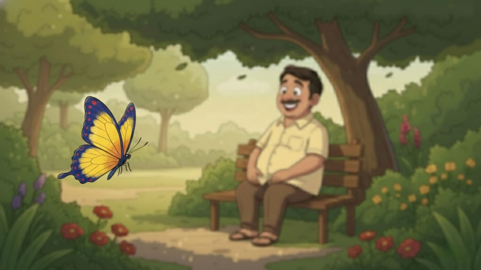 Popatlal sat on a bench under a tree. The shade was cool, and there were flowers blooming all around. A lovely butterfly flew gracefully over the flowers.