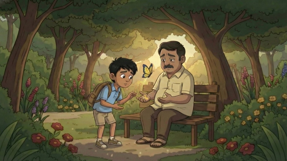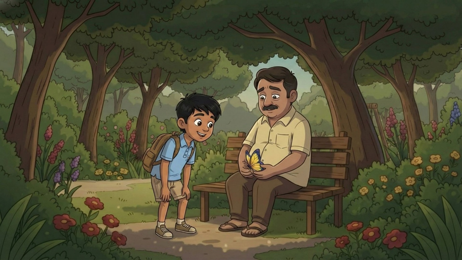 Popatlal sat down on the bench, the butterfly cupped in his hands. At that time, Vikas, a boy who often played in the garden, came by and saw him.