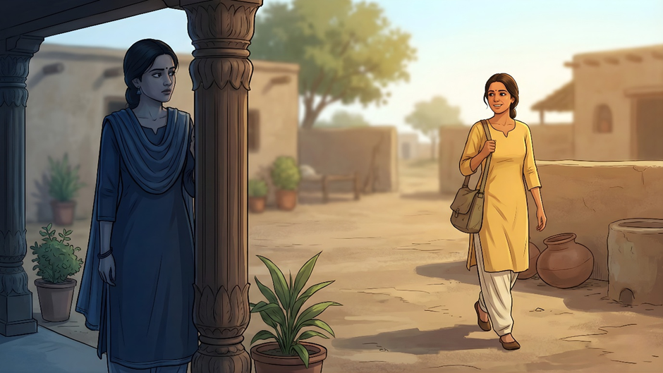 Jamna came from a poor household. Her cousin Vimala was from a wealthy family. They studied together, saw each other often, and knew each other’s lives. But they also compared them quietlyp; each believing the other was happier.