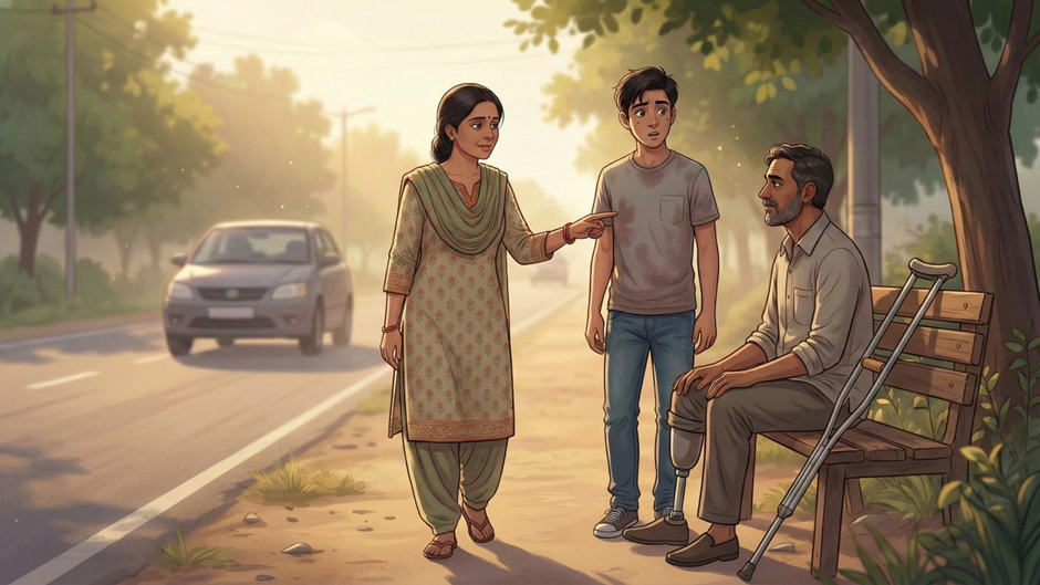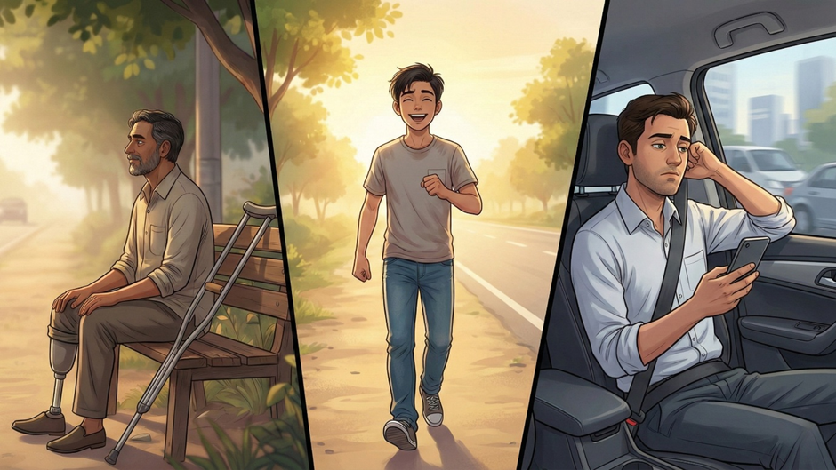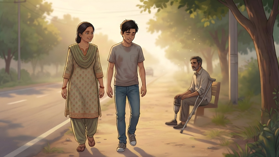The boy looked at the man, imagined his pain, and then looked at his own legs; and hopped forward happily.